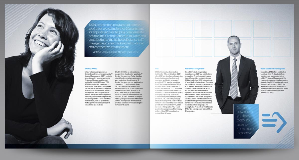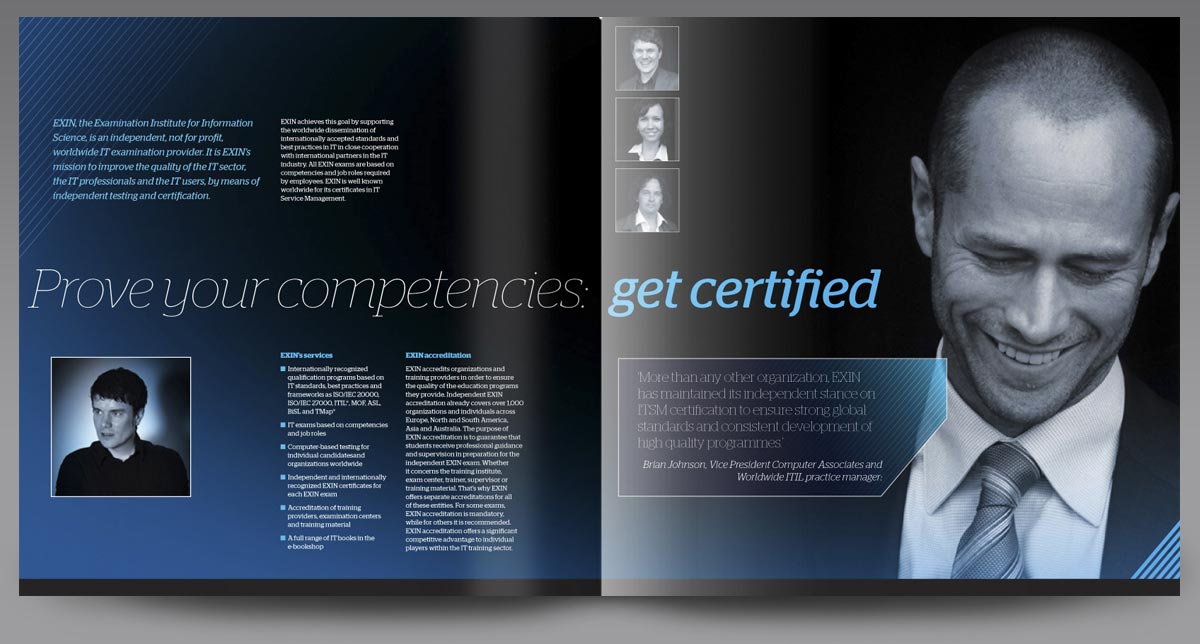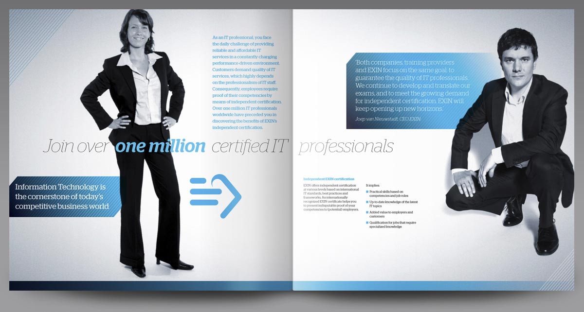 Re-brand for EXIN - a global, independent IT examination provider. The new identity has been modernised to create impact and attitude in a boring market, whilst maintaining current brand values. A Reaction Chamber project.