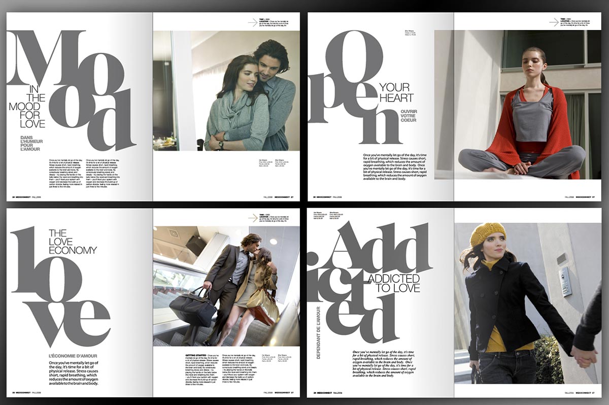 Grid and typography system for lifestyle-based loyalty program magazine, Mexx Connect. Showcasing the latest Mexx collection, the design reflects a modern-day Vogue. Worked on @ VBAT.
