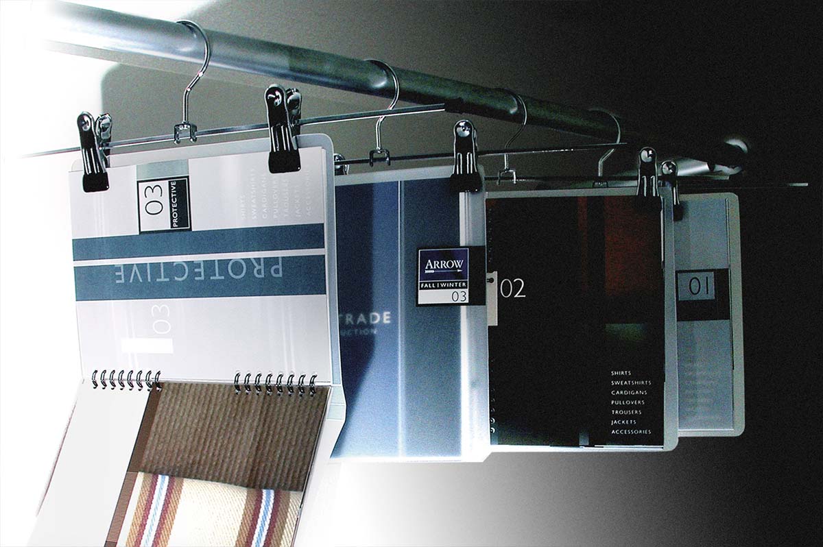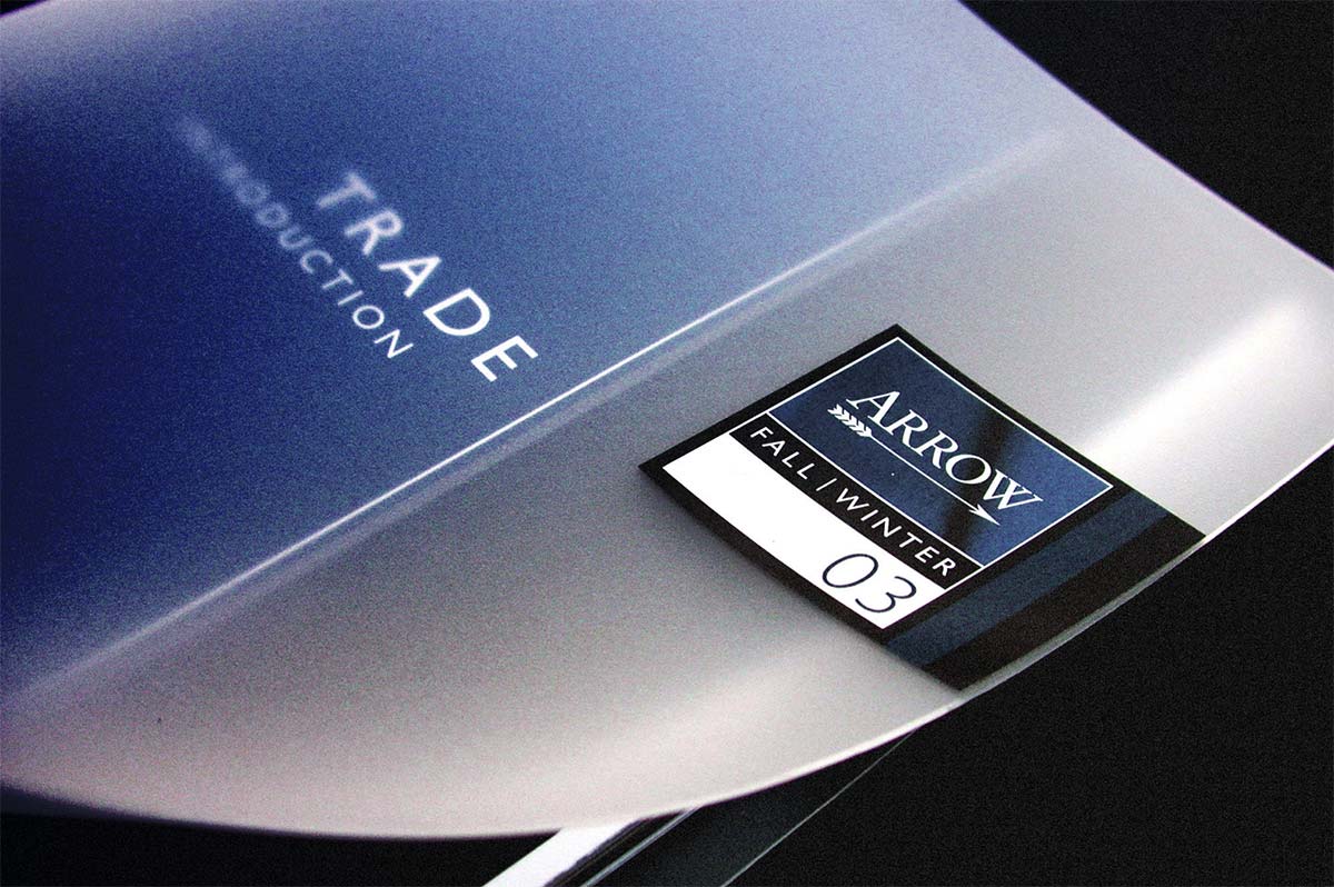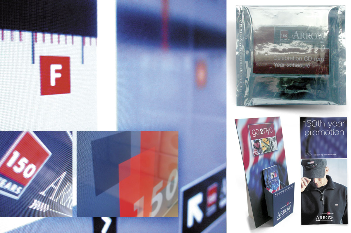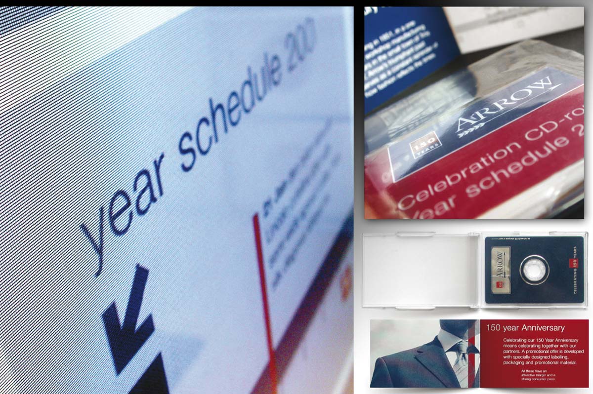 Slides 1-2 - An invitation for retailers to preview the new collection, the invite doubles up as sample book, using translucent substrates and clean graphics to echo the collection. Slides 3-4 - To celebrate 150 years, Arrow create a bespoke collection + product support. Worked on @ DJPA.