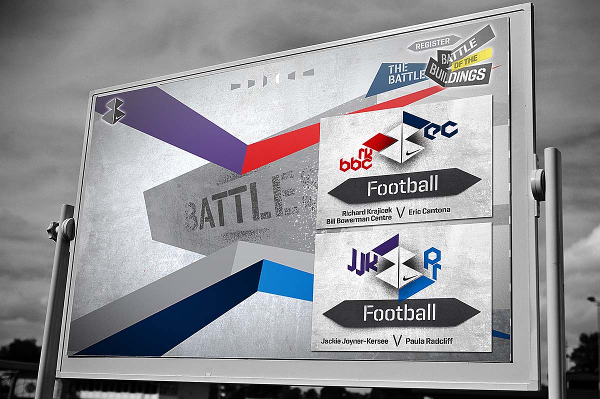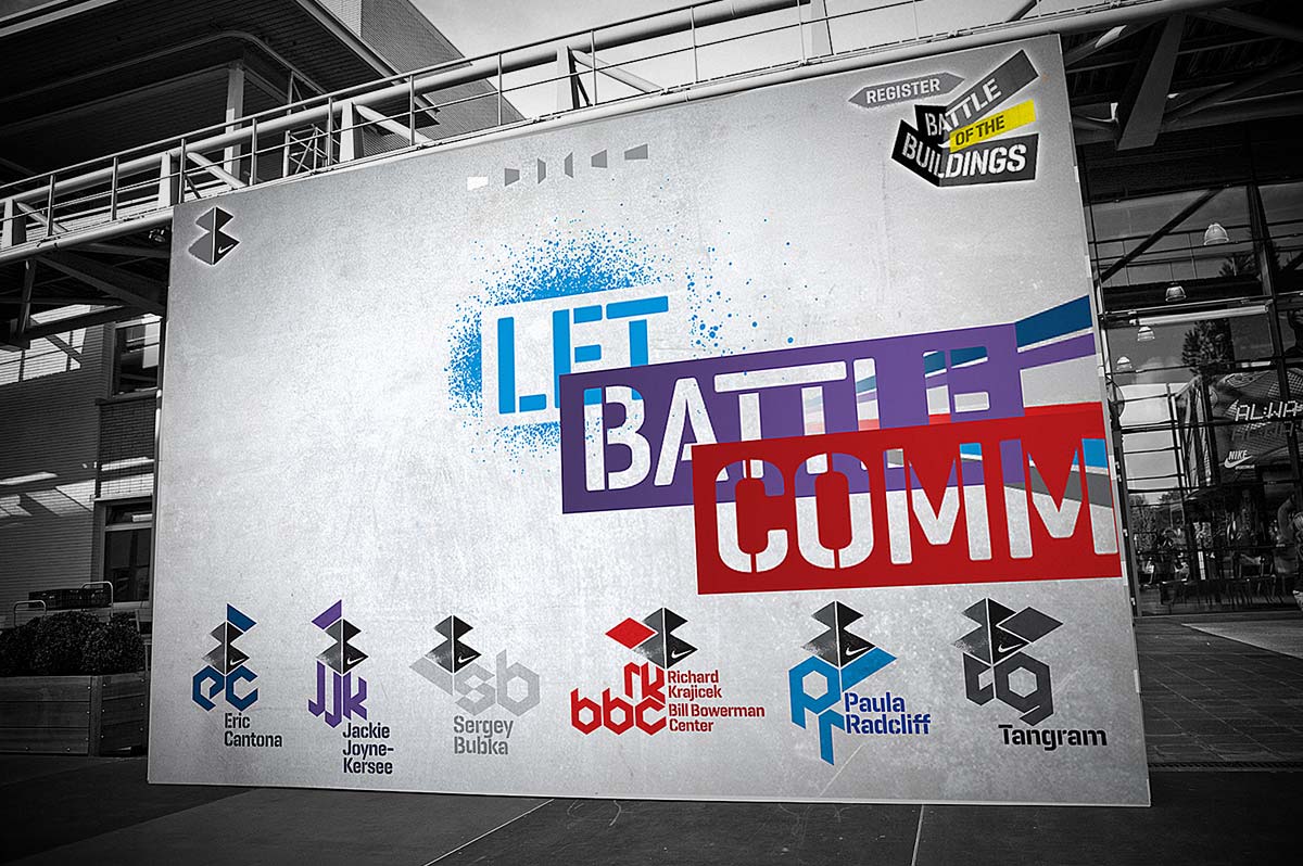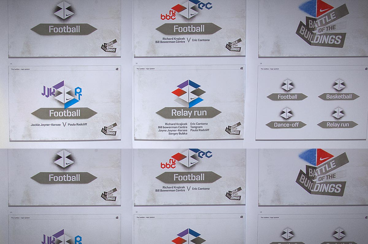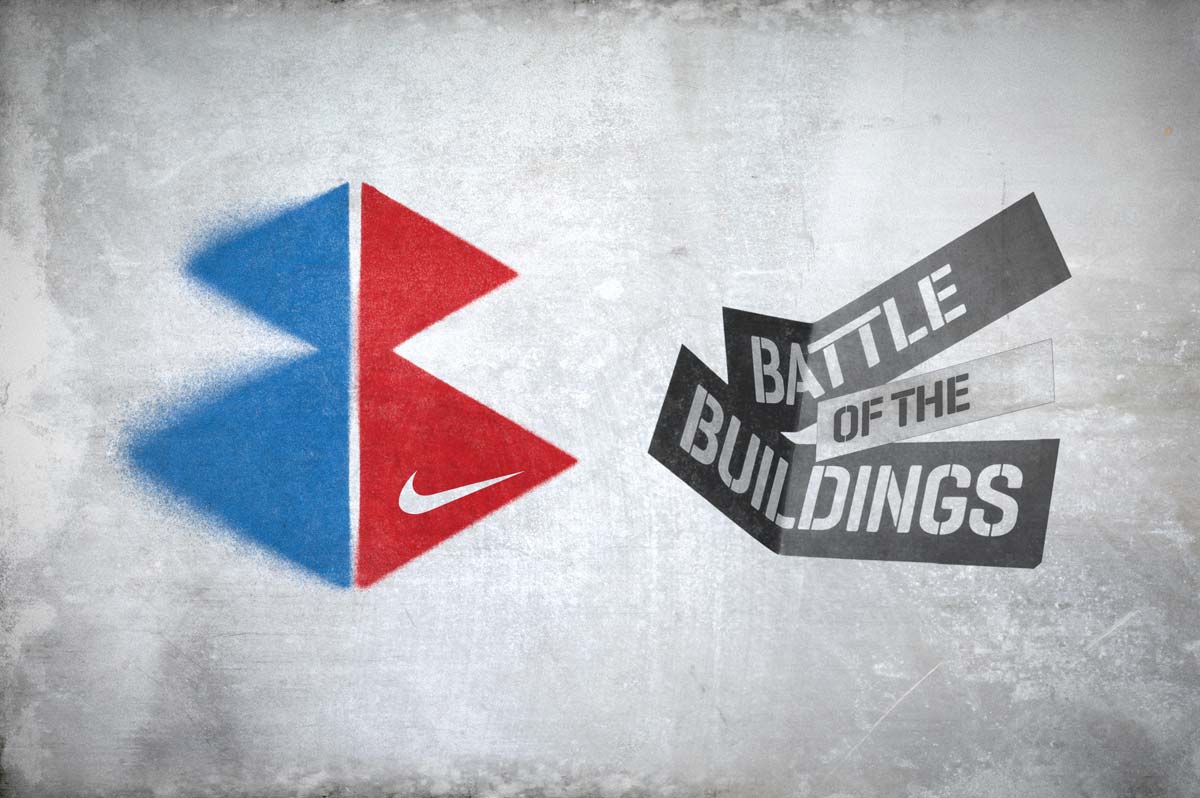 Annual corporate event held on the Nike Campus in Hilversum, Holland. Based around the friendly rivalry of the 6 campus buildings, the identity and supporting material echos both attitude and fun. Designed in collaboration with Indeed.