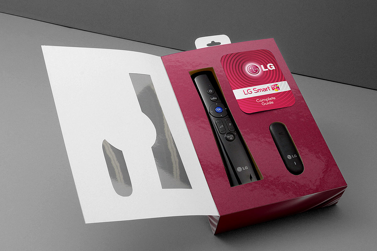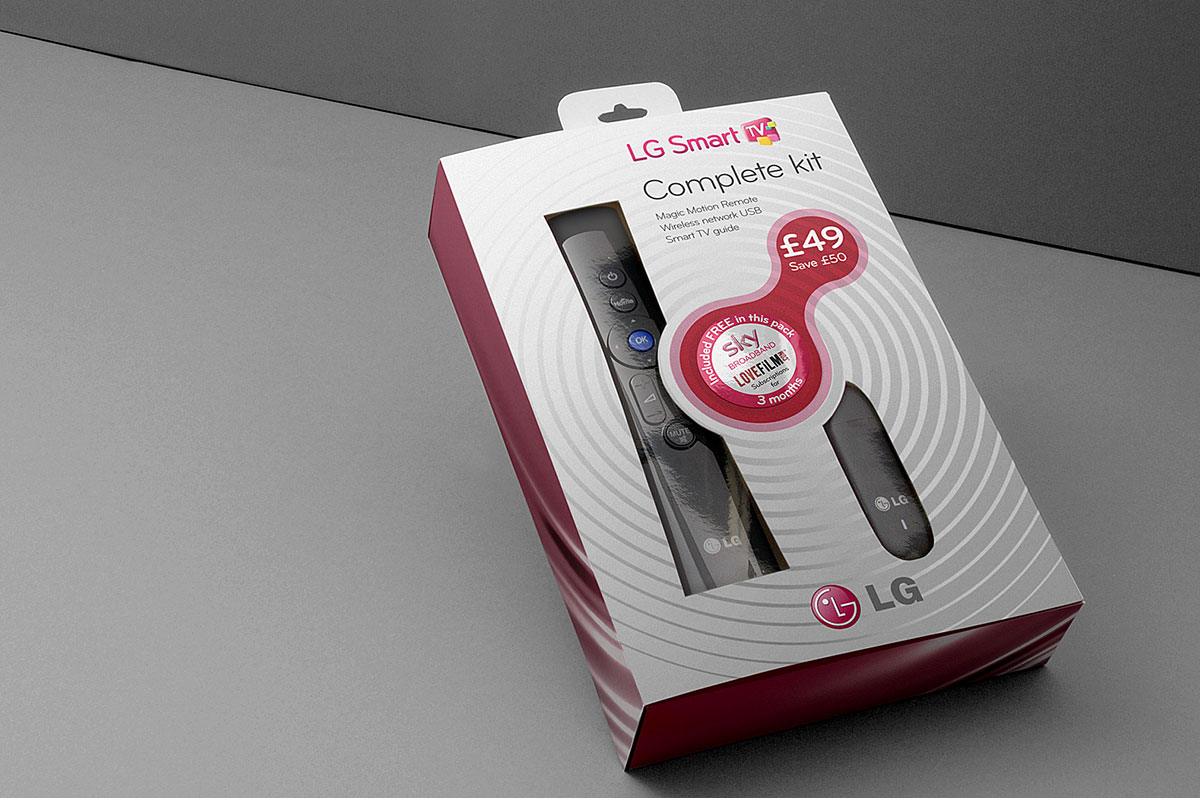 To help boost sales, LG bundled their Magic Motion gesture-controlled remote with a dongle and third party offers. The pack and accompanying literature was developed to enable updated offers with minimal re-printing.