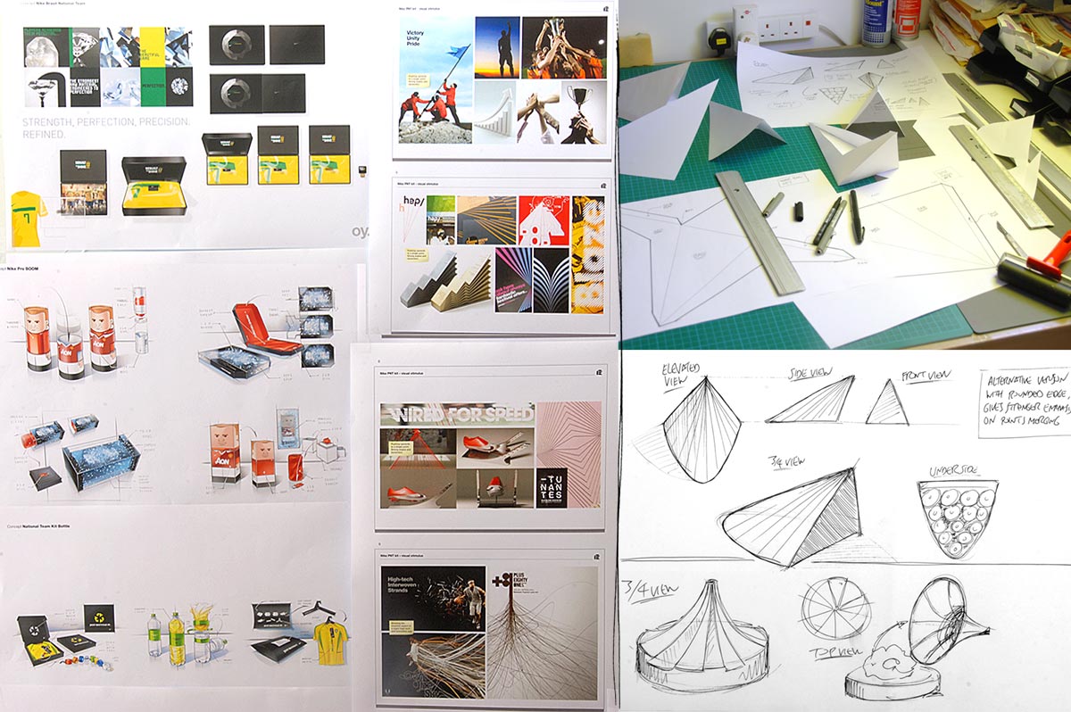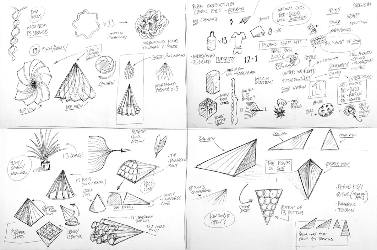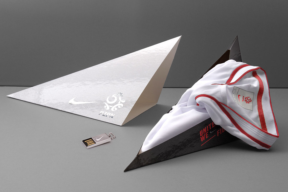Packaging concept for the team, press and stakeholders, showcasing the Nike-produced football kit made from recycled plastic bottles. The pack is designed to represent solidarity and national pride, the shape being a visual metaphor of 'United We Fight'. Designed in collaboration with Indeed.