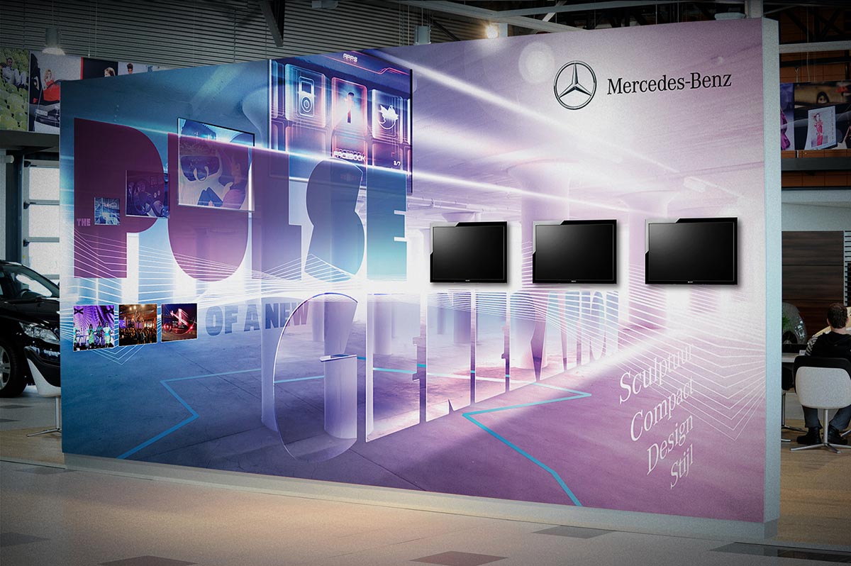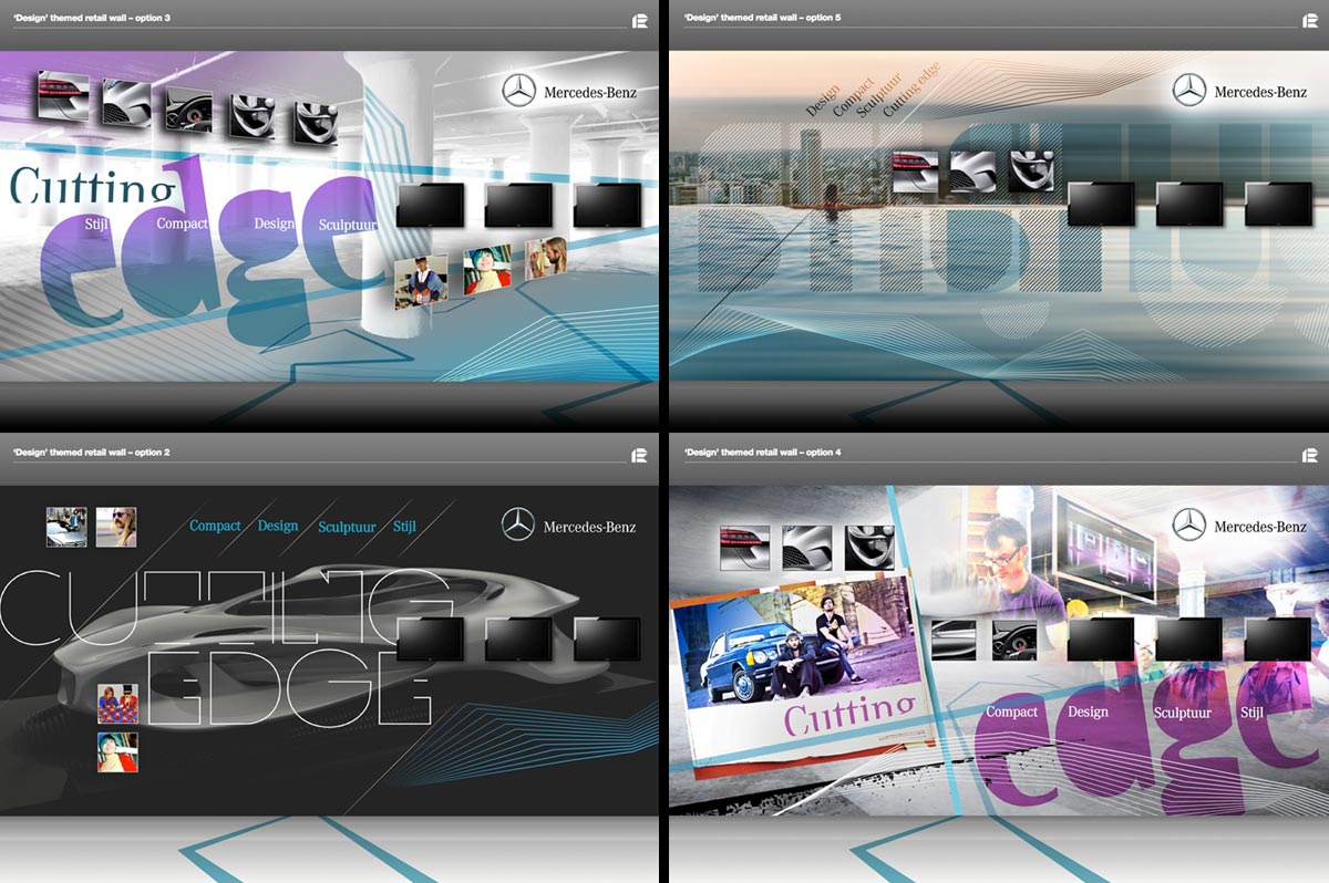 Further implementation of 2011's showroom re-design. Taking on-board the Mercedes brand values, the visual language plays into the space creating a seasonal theme, the second being 'design'.
