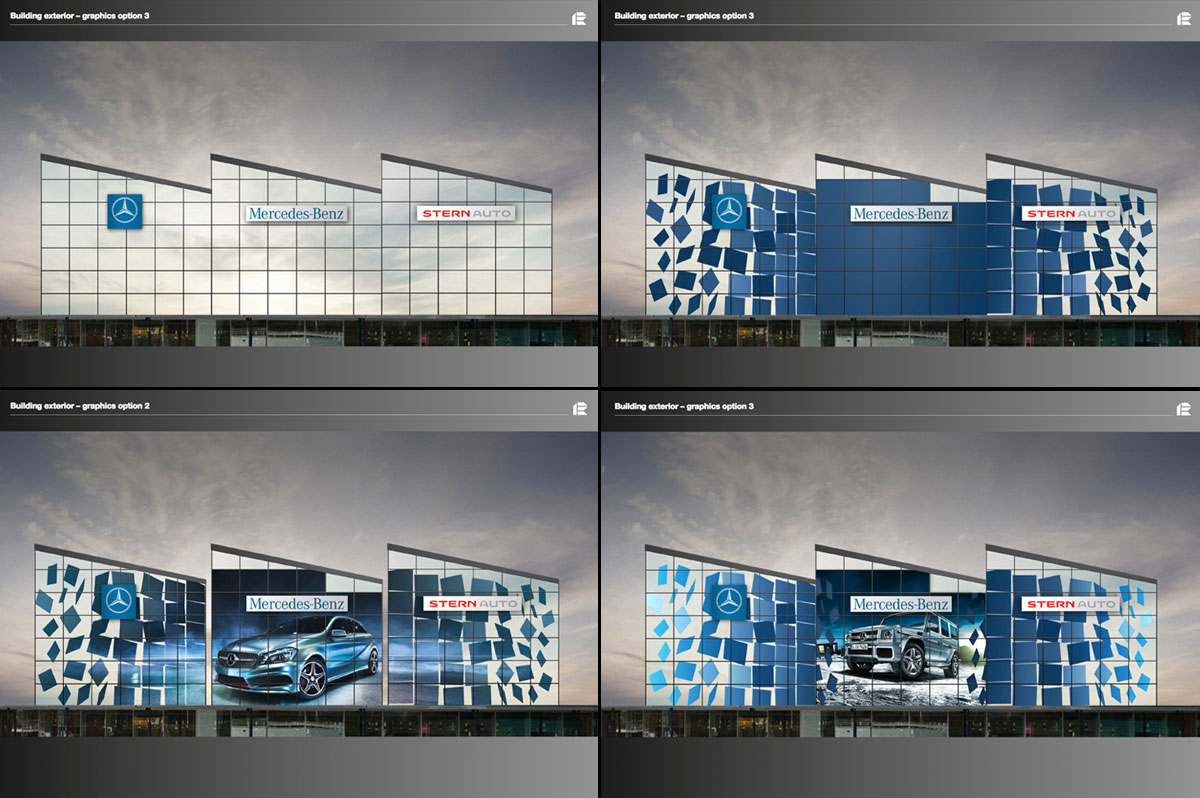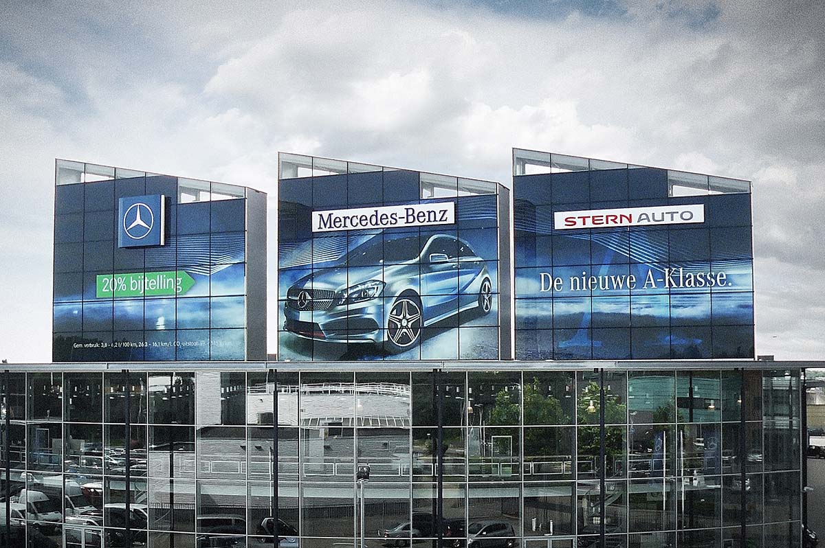 Designed to cover an entire building, this 45 metre wide billboard was created to promote the new Mercedes A-Class. Taking visual cues from the showroom graphics, the concept exaggerates the glass panels on which it is printed. Designed in collaboration with BuroLoods.