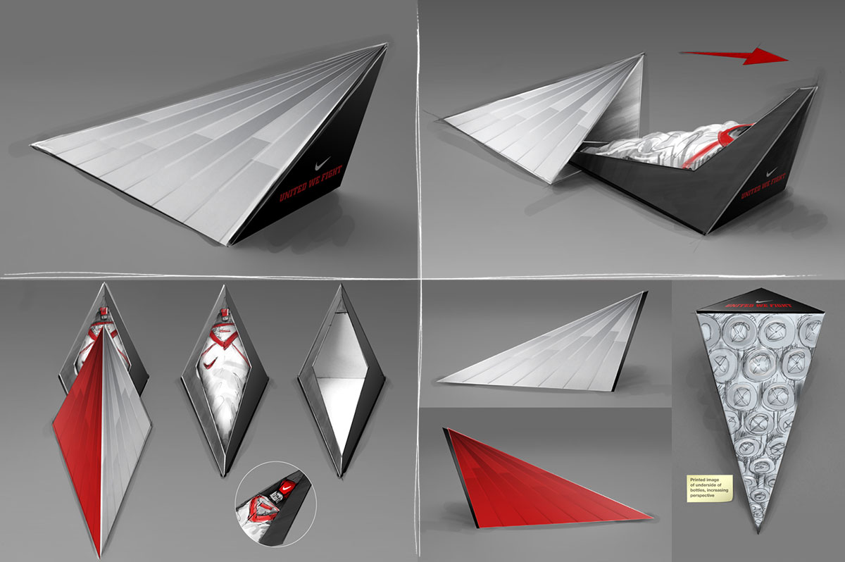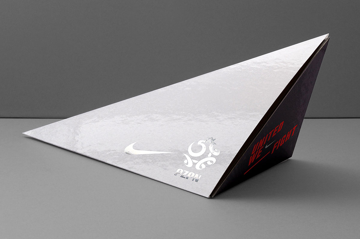 Packaging concept for the team, press and stakeholders, showcasing the Nike-produced football kit made from recycled plastic bottles. The pack is designed to represent solidarity and national pride, the shape being a visual metaphor of 'United We Fight'. Designed in collaboration with Indeed.